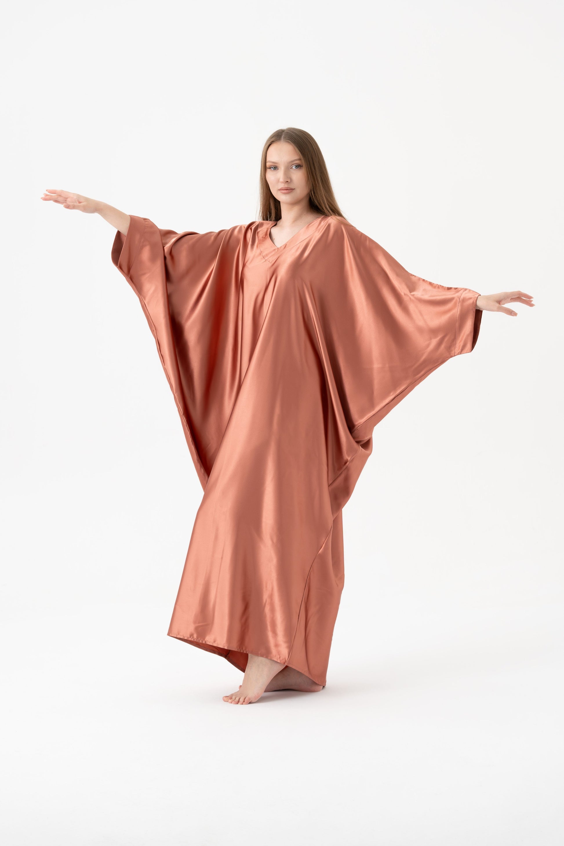 Embrace the beauty of modest fashion with the Isabela Amie Paris Modest Sunset Rose Golden Kaftan. This rose gold silk satin kaftan is glamorous with a sexy draping silhouette, and very comfortable. Rose gold is reminiscent of the precious blush toned gold metal and represents refinement and romance. Rose gold is a fashion classic and year around trend that can be given a warm vintage vibe with the right accessories. You can wear this regal and feminine handmade kaftan to the beach or a cocktail party as it is cool, light weight, silky soft and generally wrinkle free. Rose gold can be styled with black, Navy, soft blue, denim, silver, diamonds, pearls, white, yellow gold, and mint green.