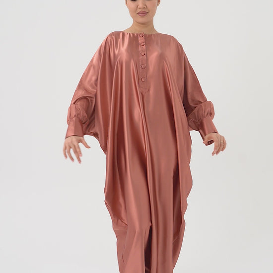 Step into the world of full-coverage luxury with the Isabela Amie Paris Traditional Sunset Rose Golden Kaftan. This rose gold silk satin kaftan is glamorous with a sexy draping silhouette, and very comfortable. Rose gold is reminiscent of the precious blush toned gold metal and represents refinement and romance. Rose gold is a fashion classic and year around trend that can be given a warm vintage vibe with the right accessories. You can wear this regal and feminine handmade kaftan to the beach or a cocktail party as it is cool, light weight, silky soft and generally wrinkle free. Rose gold can be styled with black, Navy, soft blue, denim, silver, diamonds, pearls, white, yellow gold, and mint green.