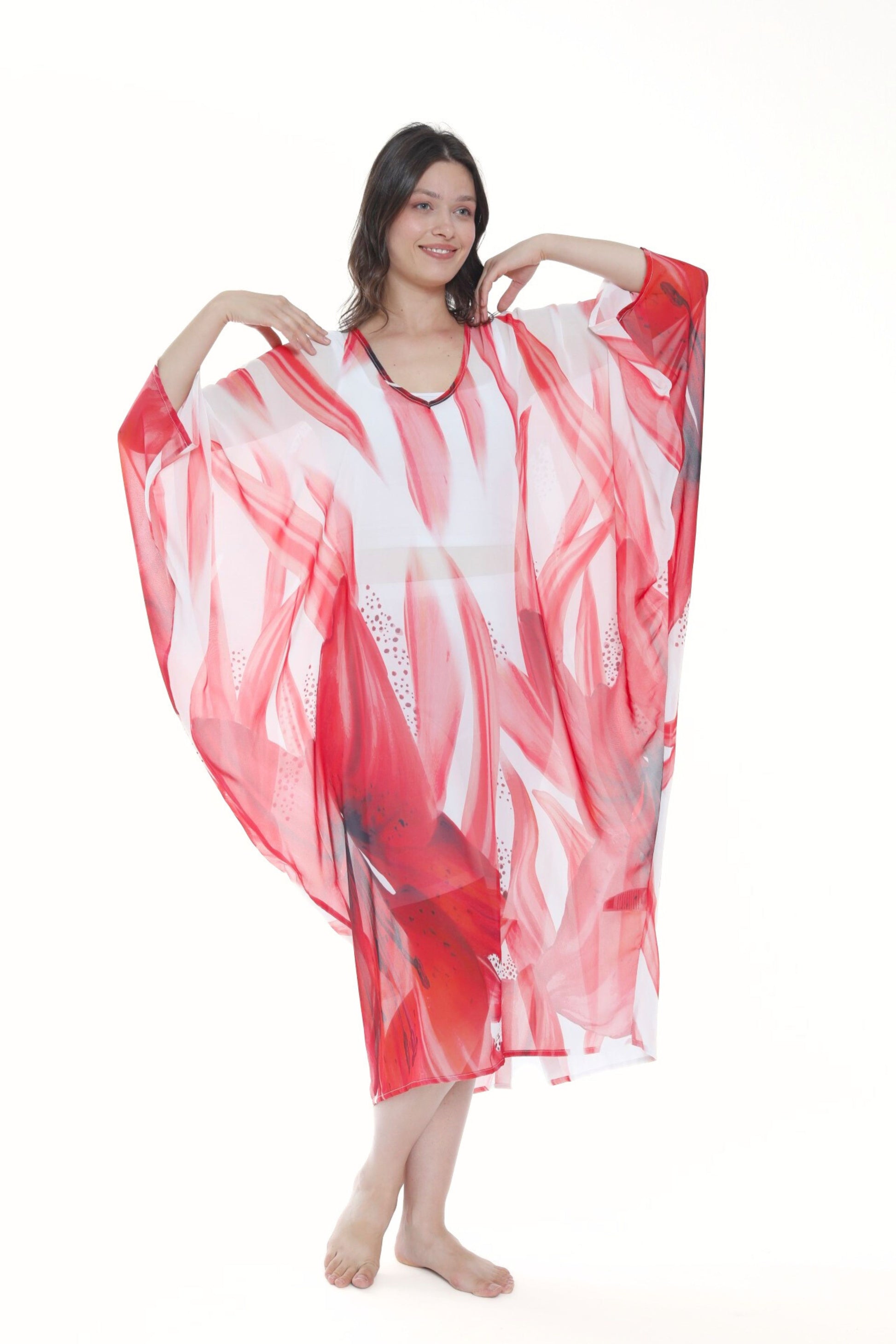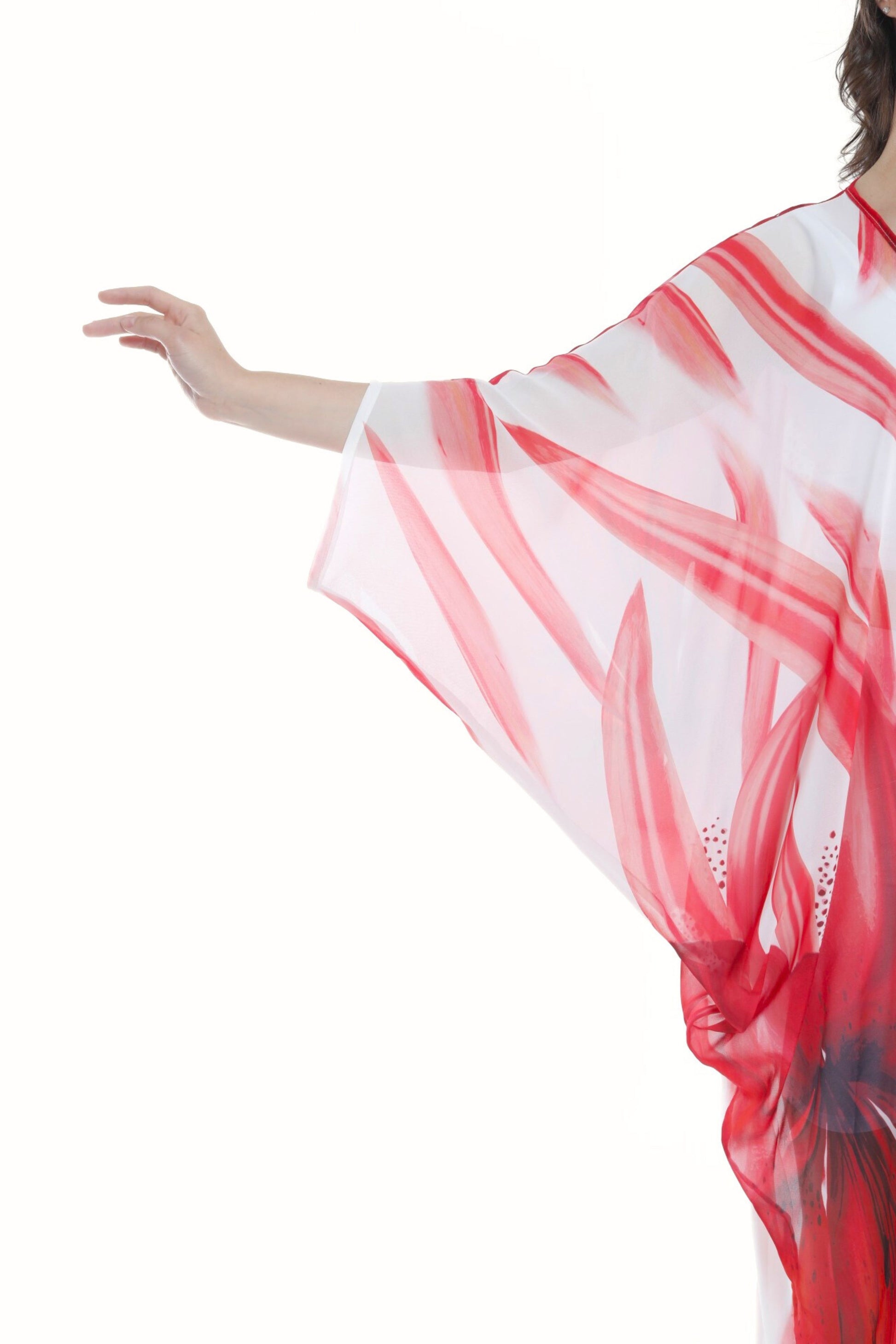 Embrace the beauty of modest fashion with the Isabela Amie Paris Modern Tropical Red Lily Kaftan. Dress to impress and be the passionate showstopper with the Isabela Amie Paris classic red silk satin kaftan. This elegantly timeless red dress will be sure to turn heads as it romantically drapes over your body giving a slimming sensual silhouette. This kaftan is sure to boost your confidence and suitable for any occasion as it is light weight and breathable. Style it with a red or nude lipstick and a belt of any color—including the same or a different red.