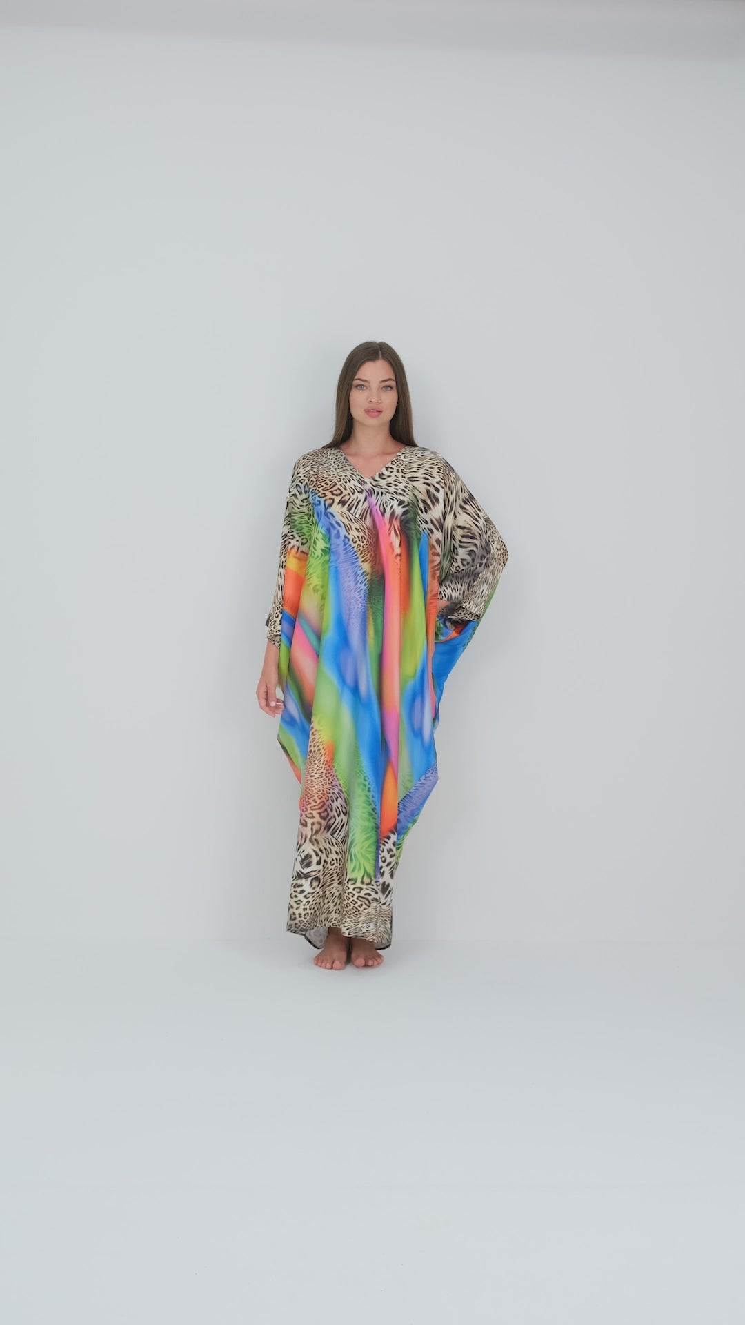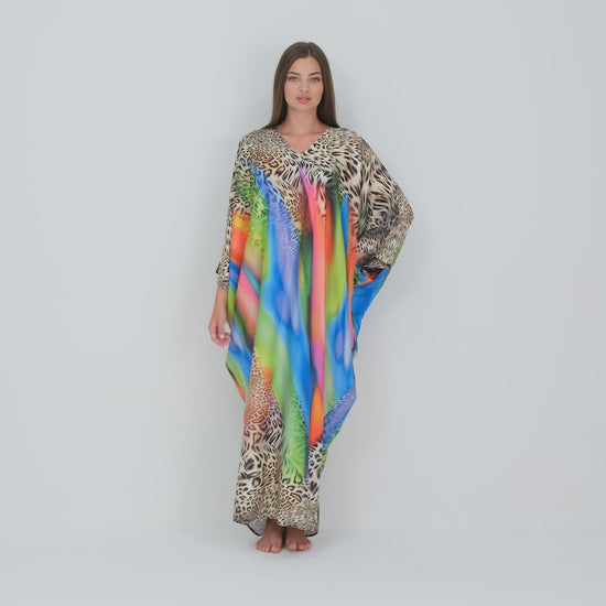 Embrace the beauty of modest fashion with the Isabela Amie Paris Modest Unapologetic Cheetah Kaftan. Create highly feminine energy wearing this silk satin cheetah print kaftan overlayed with bright gemstone like blue, green, pink and orange colors. Cheetah print has long been associated with sensuality and femininity. Before a fashion statement, historically cheetah prints were associated with status and high power for African royals and anyone who could afford it. During the 1950’s Christian Dior’s chic aesthetic embraced a luxurious animal print campaign that established cheetah print as timeless high fashion. You can style this kaftan with hot pink accessories, denim, earth tones, or any color on the dress for any event or travel destination. This luxurious kaftan can be worn anywhere from a beach resort to a formal dinner party depending on the accessories. The Drape gorgeously flows on your silhouette while reflecting light and keeping you cool and soft to the touch. This kaftan is also easy to travel with as it wrinkle-free, hypoallergenic and light weight.