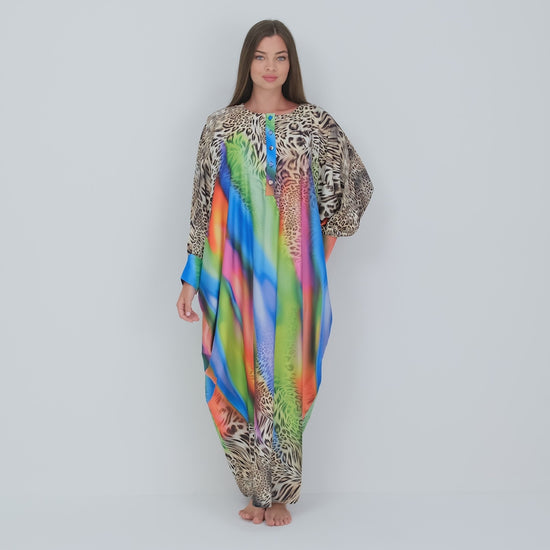 Step into full-coverage luxury with the Isabela Amie Paris Traditional Unapologetic Cheetah Kaftan. Create highly feminine energy wearing this silk satin cheetah print kaftan overlayed with bright gemstone like blue, green, pink and orange colors. Cheetah print has long been associated with sensuality and femininity. Before a fashion statement, historically cheetah prints were associated with status and high power for African royals and anyone who could afford it. During the 1950’s Christian Dior’s chic aesthetic embraced a luxurious animal print campaign that established cheetah print as timeless high fashion. You can style this kaftan with hot pink accessories, denim, earth tones, or any color on the dress for any event or travel destination. This luxurious kaftan can be worn anywhere from a beach resort to a formal dinner party depending on the accessories. The Drape gorgeously flows on your silhouette while reflecting light and keeping you cool and soft to the touch. This kaftan is also easy to travel with as it wrinkle-free, hypoallergenic and light weight.